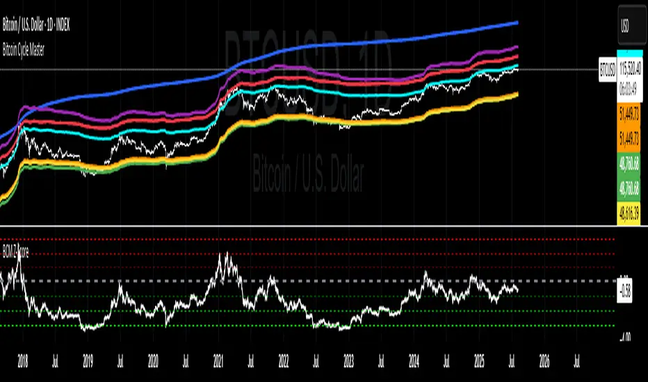 The "Bitcoin Cycle Master Z-Score" indicator is designed for in-depth, long-term analysis of Bitcoin's price cycles, using several key metrics to track market behavior and forecast potential price tops and bottoms. The indicator integrates multiple moving averages and on-chain metrics, offering a comprehensive view of Bitcoin’s historical and projected performance. Each of its components plays a crucial role in identifying critical cycle points.