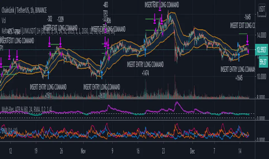 This is a long-only strategy tested on LINK/USDT, 1 hour bar, from Feb 2019. The entry is determined by the breakout of upper Keltnel Channel and when the +DI is higher than 32. Instead of a fixed stop-loss from the original script , I change the exit to the middle band of the Keltnel Channel. 1st profit target will close 20% of the position. 2nd profit target will close 30% of the position. While the remaining 50% position will be closed when the price closes below the middle band of the Keltnel Channel, to take advantage of big trend. All parameters are adjustable. I added another option to enable or disable the ribbon trend filter.