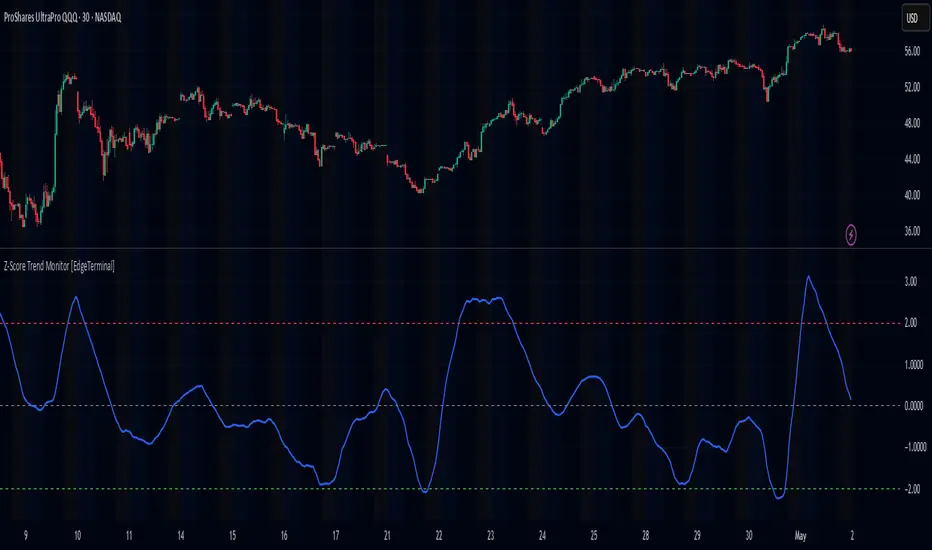 The Z-Score Trend Monitor measures how far the short-term moving average deviates from the long-term moving average using the spread difference of the two — in standardized units. It’s designed to detect overextension, momentum exhaustion, and potential mean-reversion points by converting the spread between two moving averages into a normalized Z-score and tracking its change and direction over time.