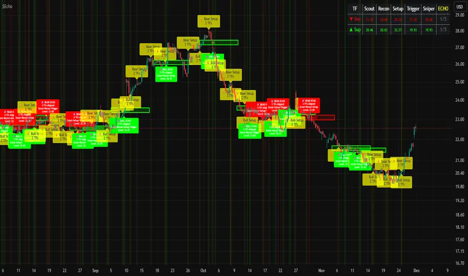 This indicator catches the “echo” — when 3–5 timeframes are printing fractals at almost the exact same price level.