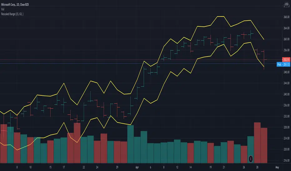 This study builds upon the bridge range work of Joe Catanzaro (joecat808) and Caleb Sandfort (calebsandfort). Bridge ranges are used to position the rescaled range with respect to the closing price.