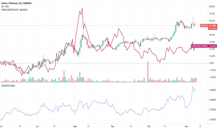 This TradingView indicator calculates and visualizes the ratio between Coinbase's stock price (COIN) and Ethereum's price (ETH) to help traders compare Coinbase's performance relative to Ethereum over time. This can be useful for those interested in understanding correlations or relative strength between a traditional crypto exchange stock and a major cryptocurrency.
