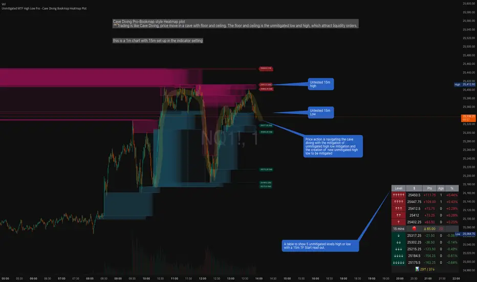 You can set the indicator to track high/low levels from any timeframe (default is 15 minutes). This means you're watching for unmitigated 15-minute highs and lows while trading on, say, a 1-minute or 5-minute chart.
