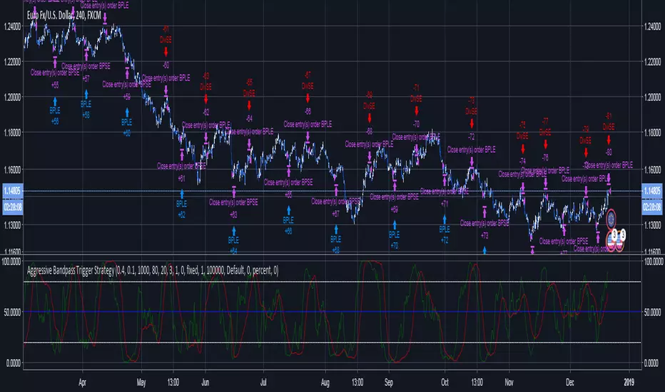 This uses the Aggressive Bandpass Trigger Ver 3 to place a trade on an overbought/oversold inflection point of the Lead line and the Phase line above/below the midline