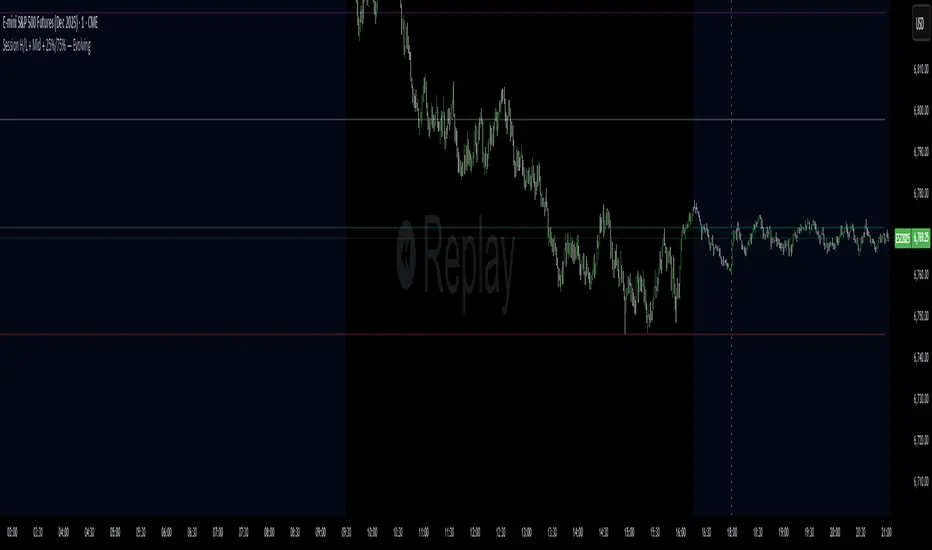 Plots Session High and Low + the Midpoint between the two and also plots at 25% and 75% (Good for initial and rolling up/down stops)