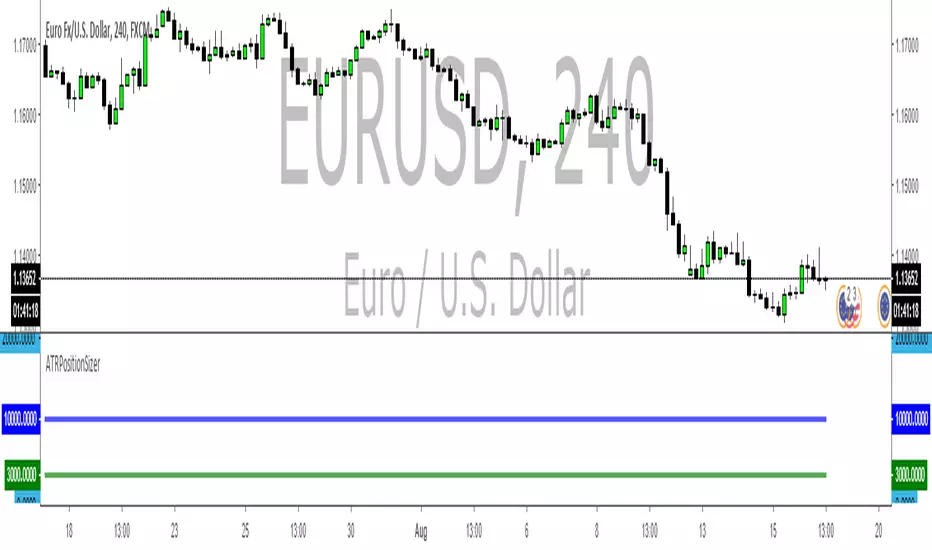 The ATR position sizer plots the recommended trade size (green) and equity line (blue).