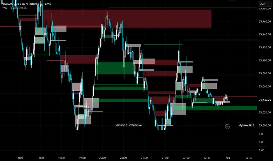 This is a precision execution tool around Fair Value Gaps (FVG) and Inverted FVG (IFVG) with optional higher-timeframe confluence, HTF liquidity levels and session levels (Asia / London / Yesterday’s High–Low / Daily 50%).