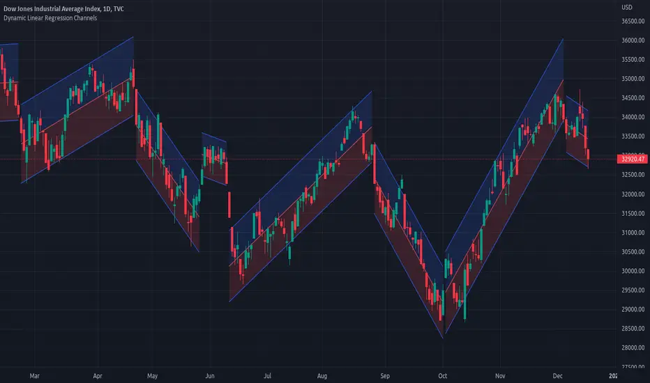 Plots new linear regression channels from points where a previous channel is broken thus keeping the length of bars in the trend dynamic. Regression channels are useful in detecting trend changes, support and resistance levels and to trade mean reversions.