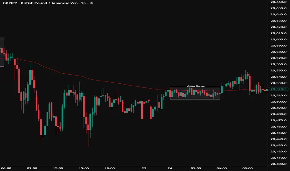The script uses session-time detection to determine whether each bar belongs to the Asia session. While the bar is inside the session window, the range is updated using simple, transparent logic: