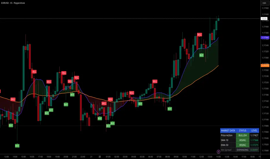 This indicator is a professional Trend & Signal analysis tool designed to help traders identify market direction, entries, and momentum strength at a glance. It combines a customizable dual Moving Average system with an advanced real-time Information Dashboard.