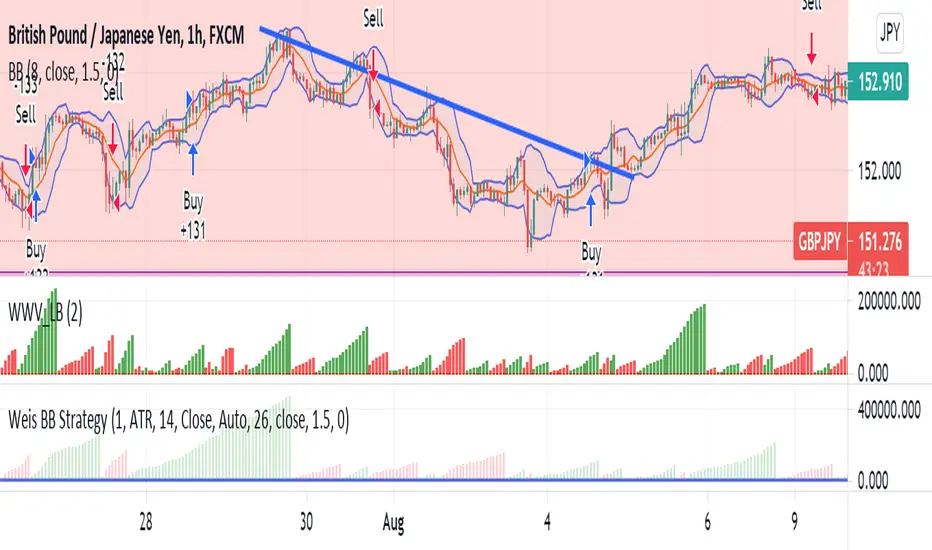 This is a strategy based on Weis Wave & EMA. Weis Wave Volume is used to determine the overall trend and Bollinger Band to determine the Price breaking out from resistance zones.