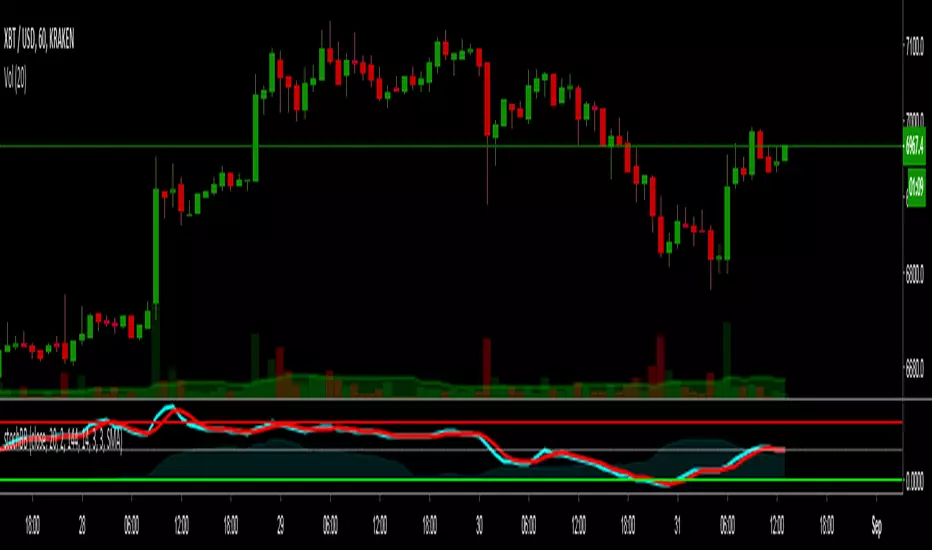 The stochastic length for the width is set to be very long (144 periods) in order to encapsulate a long range of values to compare to.
