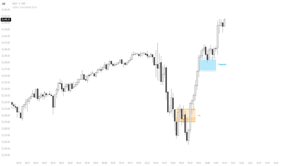 Multi-asset Suspension Block detection with correlation matching, dynamic zone extension, and an inversion lifeline system. Identifies high-conviction imbalances that go beyond a standard Fair Value Gap.