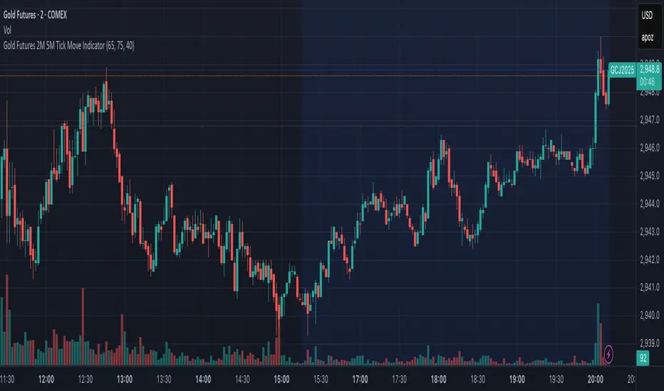The Gold Futures Tick Move Indicator is designed for traders who rely on tick-based price movements to detect significant market activity. This indicator identifies strong momentum moves, triggers customizable buy and sell signals, and provides clear trade range visualizations with take profit and stop loss levels.