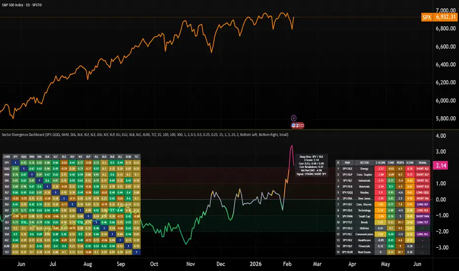 This Sector Divergence Dashboard is a tool designed to identify mean-reversion opportunities across U.S. equity sectors. I've built it to help me with portfolio management and sector allocation by identifying uncorrelated sectors and divergences between indices and sector ETFs. These divergences are often good investment opportunities.