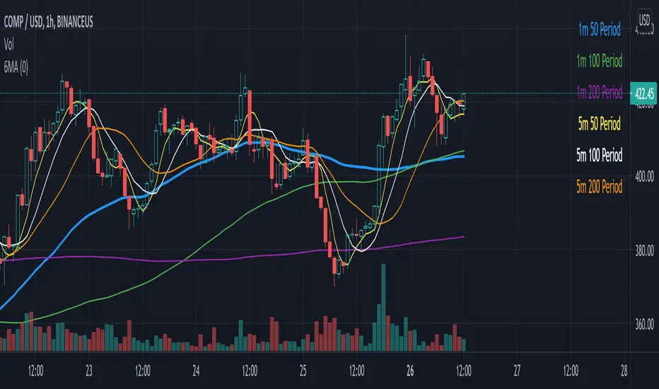 The 1m 50 period is a little thicker because it's the most important MA in this algo. As price golden crosses each line it becomes a stronger buy signal, with added weight on the 1m 50 period MA. If price crosses all six I consider it a strong buy signal though your mileage may vary.