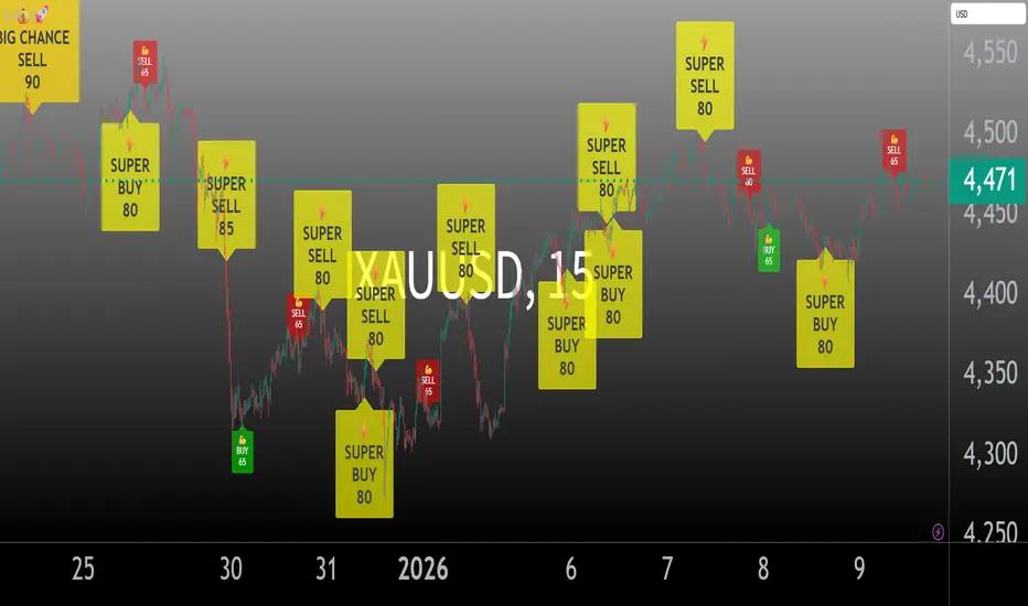 This indicator combines QQE (Quantitative Qualitative Estimation) with HMA (Hull Moving Average) and introduces a unique AI-based scoring system that rates signal quality from 0-100. Unlike traditional QQE indicators that show simple buy/sell signals, this version categorizes signals into four strength levels: BIG CHANCE, SUPER, POWER, and STRONG.