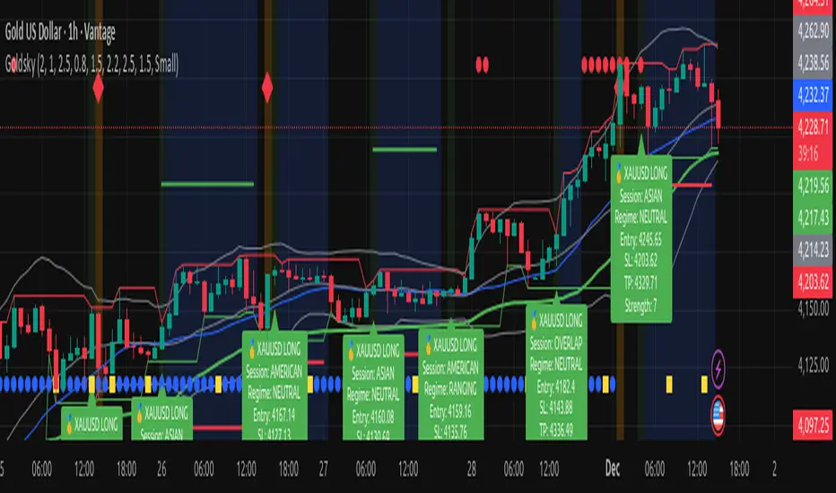 Goldsky is a sophisticated TradingView Pine Script indicator designed exclusively for XAUUSD (Gold) trading. It features adaptive parameter adjustment, session-based optimization, market regime detection, news event filtering, multi-timeframe analysis, and intelligent risk management specifically calibrated for gold's unique market characteristics.Features