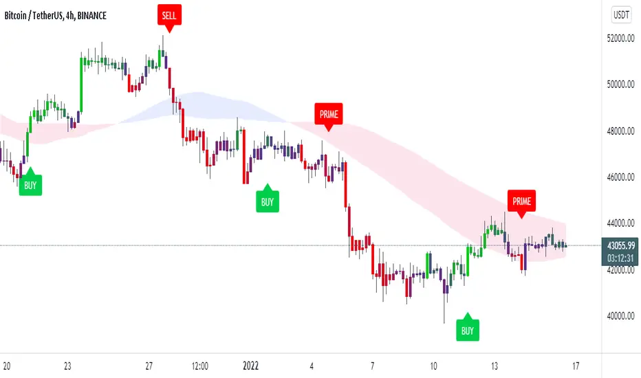 The Confirmation Signals includes a special type of signal called "Prime" which includes candle coloring to see the strength of the trend.