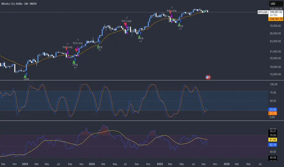This strategy was built with Bitcoin in mind and tends to perform best on higher timeframes like the Weekly charts. It aims to capture major swings rather than small, quick scalps.