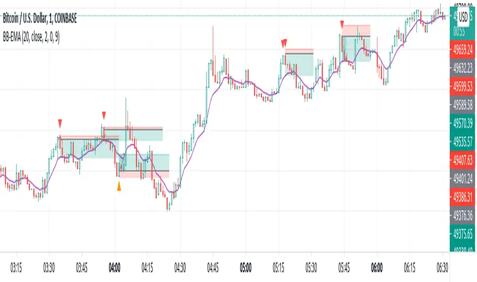 This is based on Bollinger Bands and Exponential Moving Average. The logic is so simple: It will wait until the a candle starts to poke out of the BB. When it figures out a price outside the band, it will be altered for next candle. If the next candle close back inside the band, it will be marked with a up triangle (for long positions) or down triangle (for short positions). The take profit level would be the Exponential Moving Average.