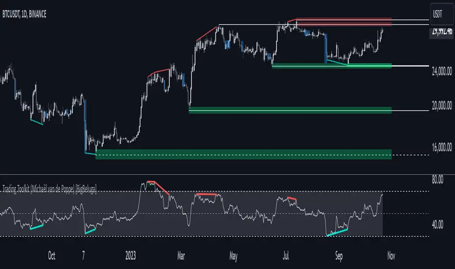 Trading Toolkit [BigBeluga] is a comprehensive indicator inspired by the trading strategies of the renowned crypto influencer Michaël van de Poppe. This tool combines RSI divergences, correction zones, and advanced support/resistance levels to provide traders with a robust framework for analyzing market movements.