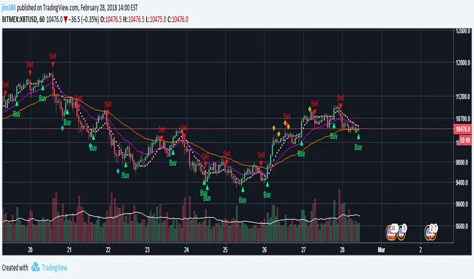 1. buy/sell signals determined by EMAs crossover (better for position or swing trades)