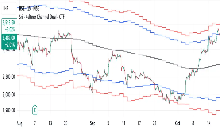 The Sri – Keltner Channel Dual – CTF indicator is an advanced multi–timeframe version of the classic Keltner Channel. It allows you to visualize and compare two independent Keltner Channels simultaneously — each computed on custom timeframes with fully configurable parameters for adaptive volatility analysis.