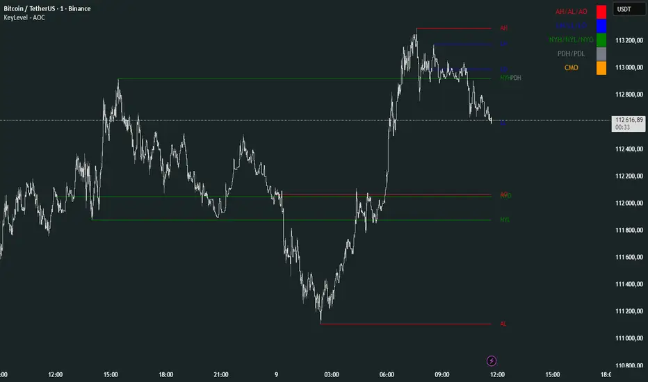 ✨ Features📈 Session Levels: Tracks high, low, and open prices for Asian, London, and New York sessions.📅 Multi-Timeframe Levels: Plots previous day, week, month, quarter, and yearly open/high/low levels.⚙️ Preset Modes: Choose Scalp, Intraday, or Swing presets for tailored level displays.🎨 Customizable Visuals: Adjust colors, line styles, and label abbreviations for clarity.🖼️ Legend Table: Displays a color-coded legend for quick reference to session and period levels.🔧 Flexible Settings: Enable/disable specific sessions or levels and customize UTC offsets.