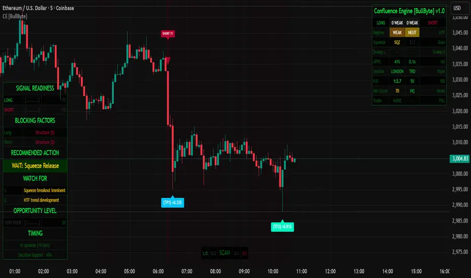 Confluence Engine is a multi-dimensional technical analysis framework that evaluates market conditions across five distinct analytical pillars simultaneously. Rather than relying on a single indicator or signal source, this tool synthesizes Structure, Momentum, Volume, Volatility, and Pattern analysis into a unified scoring system that identifies high-probability trading opportunities when multiple technical factors align.