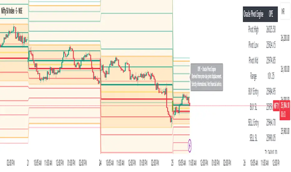 The Oracle Pivot Engine (OPE) is a market-structure visualization tool that derives all its levels exclusively from historical price data — specifically, the previous day’s high, low, and mid-range.