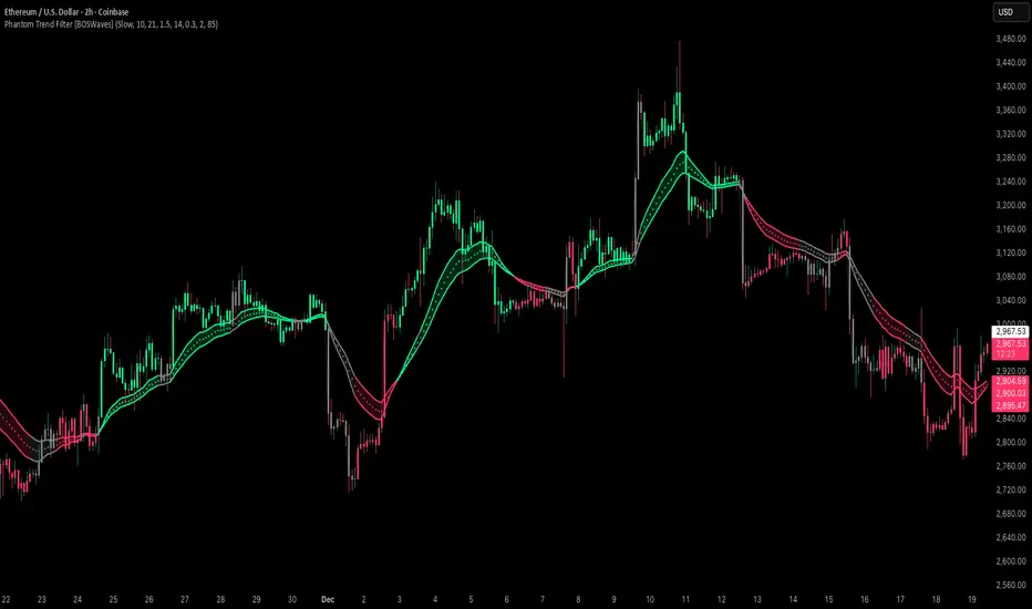 Phantom Trend Filter [BOSWaves] is a professional-grade trend-regime and volatility-filtering tool provided for educational and informational purposes only and does not constitute financial advice. It does not predict future price movement and does not guarantee profitability. Trading involves significant risk, and past performance is not indicative of future results. Performance depends on market conditions, parameter selection, disciplined execution, and proper risk management. Users are solely responsible for their own analysis, risk controls, and execution decisions.