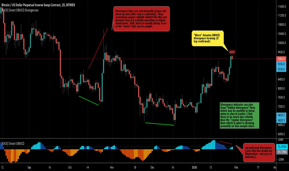 The Smart OBVCD Divergence indicator (THE RELATED INDICATOR) plots Regular and Hidden Bullish and Bearish divergence on higher timeframes based on the calculations and also provides early “warnings” for unconfirmed divergences forming (note: these are unconfirmed because the higher high or lower low have now yet been confirmed on the higher timeframe).