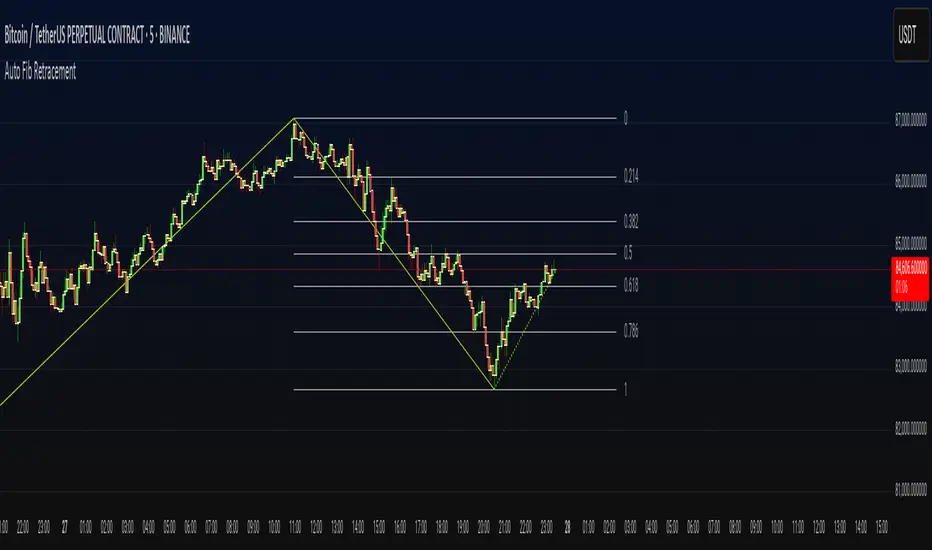 Auto Fib Retracement is an automated Fibonacci retracement tool for TradingView that dynamically identifies key swing points and plots Fibonacci levels to help traders visualize potential support and resistance areas. Using a Zigzag algorithm, the indicator detects recent pivot highs and lows and calculates retracement levels based on these significant price swings. Key features include: