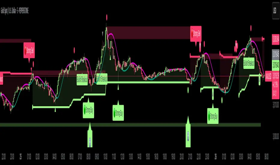 The indicator employs a proprietary Smart Trendline that adapts to market conditions using an advanced moving average system. Unlike traditional moving averages that simply track price, the Smart Trendline incorporates volatility data to change colors based on momentum strength, providing immediate visual feedback about the current market phase with zero lag.