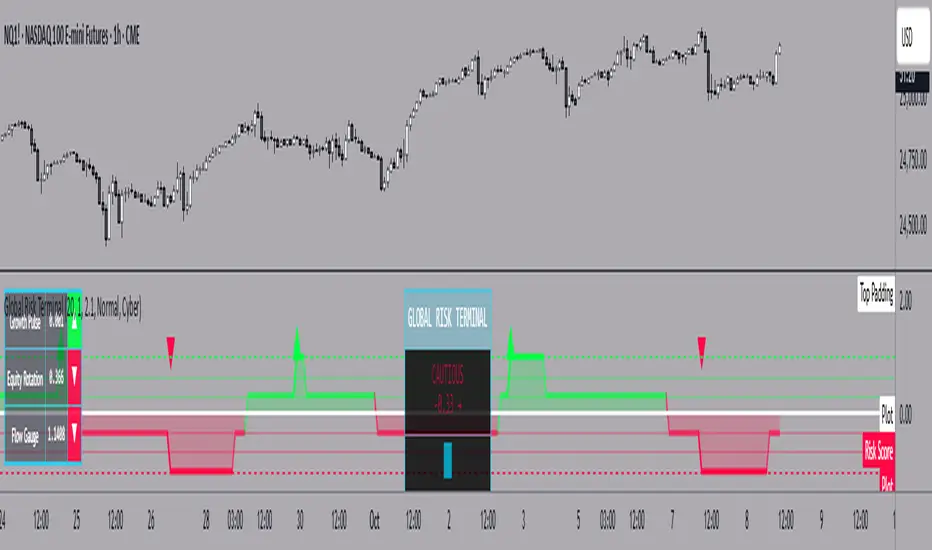 The Global Risk Terminal is a sophisticated macro sentiment indicator that synthesizes signals from three key cross-asset relationships to produce a single, actionable risk appetite score. It is designed to help traders and investors identify whether global markets are in a risk-on (growth-seeking) or risk-off (defensive) regime. The indicator analyzes the behavior of commodities, equities, bonds, and currencies to generate a comprehensive view of market conditions.