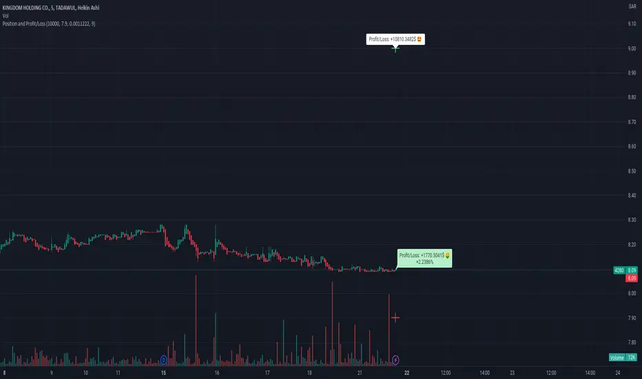 In addition to the main profit/loss label, the script also displays two auxiliary labels. The "BuyPrice" label presents the buy price of the position as a red cross symbol on the chart, allowing users to easily identify their entry point. The "targetSell" label displays the target sell price as green cross symbol, indicating the desired exit point for the position. These visual markers help users visualize their trading strategy.