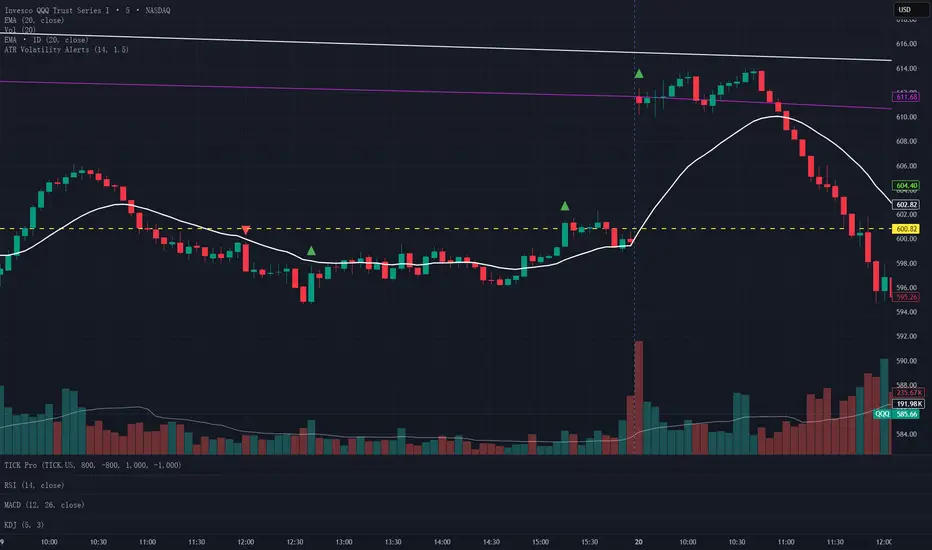 This is a dynamic alert tool based on the Average True Range (ATR), designed to help traders detect sudden price movements that exceed normal volatility levels. Whether you are trading breakouts or monitoring for abnormal spikes, this indicator visualizes these events on the chart and triggers system alerts when the price move exceeds your specified ATR multiplier.