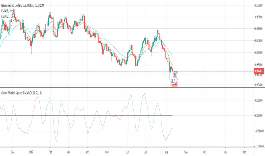 When the indicator approaches it's upper or lower limits, it will indicate either sideways price movement or a reversal. When the color changes around it's upper or lower limits from green to red or vice-versa, an EMA crossover just occurred and a continuation of trend is possible before a pause or reversal in price.