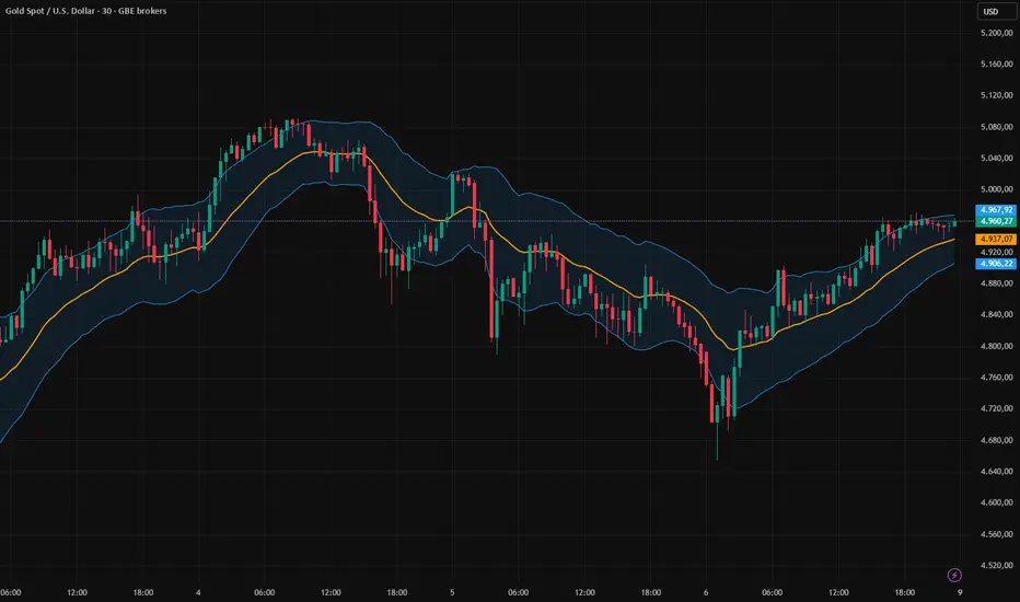 The area between the upper and lower bands can be filled with a semi-transparent color to clearly visualize the active volatility range. All colors are fully customizable for clean chart integration.