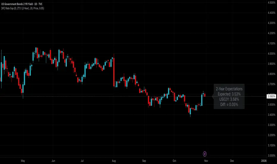 This Pine Script indicator reveals what the futures market expects for interest rates across three key durations: Fed Funds (overnight), 2-Year, and 10-Year Treasury yields. By comparing futures-implied rates against current spot yields, it provides a clear visual signal of whether the market expects rates to rise, fall, or remain steady.