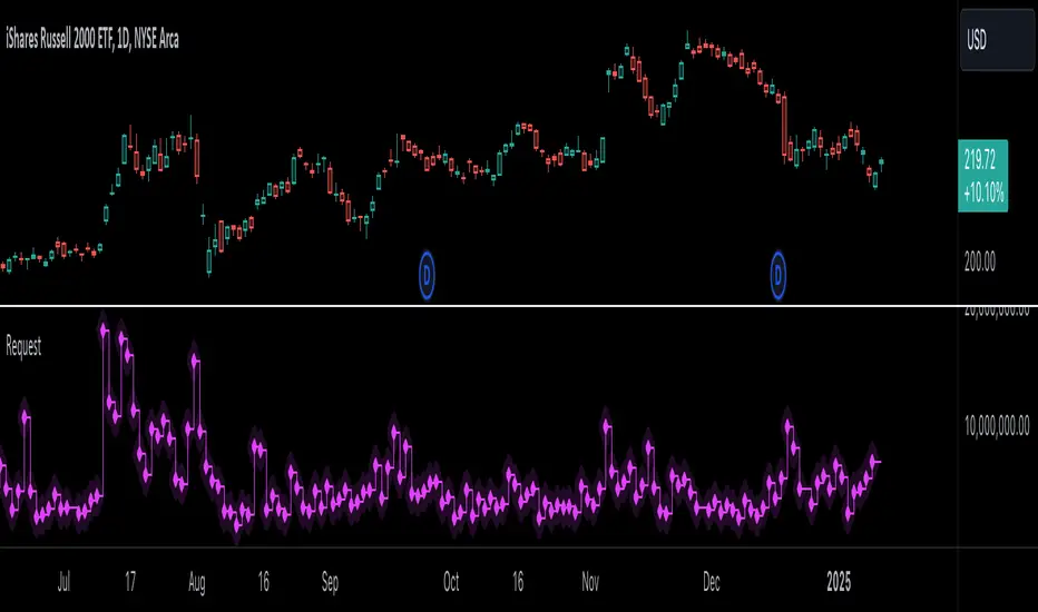 • This library uses dynamic requests, allowing dynamic ("series") arguments for the parameters defining the context (ticker ID, timeframe, etc.) of a `request.*()` function call. With this feature, a single `request.*()` call instance can flexibly retrieve data from different feeds across historical executions. Additionally, scripts can use such calls in the local scopes of loops, conditional structures, and even exported library functions, as demonstrated in this script. All scripts coded in Pine Script™ v6 have dynamic requests enabled by default. To learn more about the behaviors and limitations of this feature, see the Dynamic requests section of the Pine Script™ User Manual.
