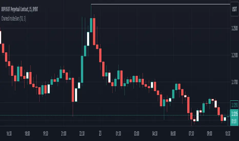 This script identifies consecutive inside bars by referencing only the most recent non-inside bar, so it avoids excessive lookback. An “inside” bar means its high is lower than the reference bar’s high, and its low is higher than the reference bar’s low. If the current bar is inside, it’s colored white; once price breaks outside, the script updates that new bar as the next reference.