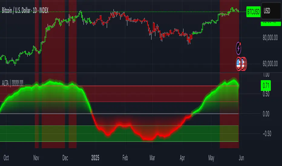 Another way to interpret the 𝓐𝓛𝓣𝓐 is through overbought and oversold conditions. When the 𝓐𝓛𝓣𝓐 rises above the +0.7 threshold, it suggests an overbought market and signals a strong uptrend. Conversely, a drop below the -0.7 level indicates an oversold condition and a strong downtrend.