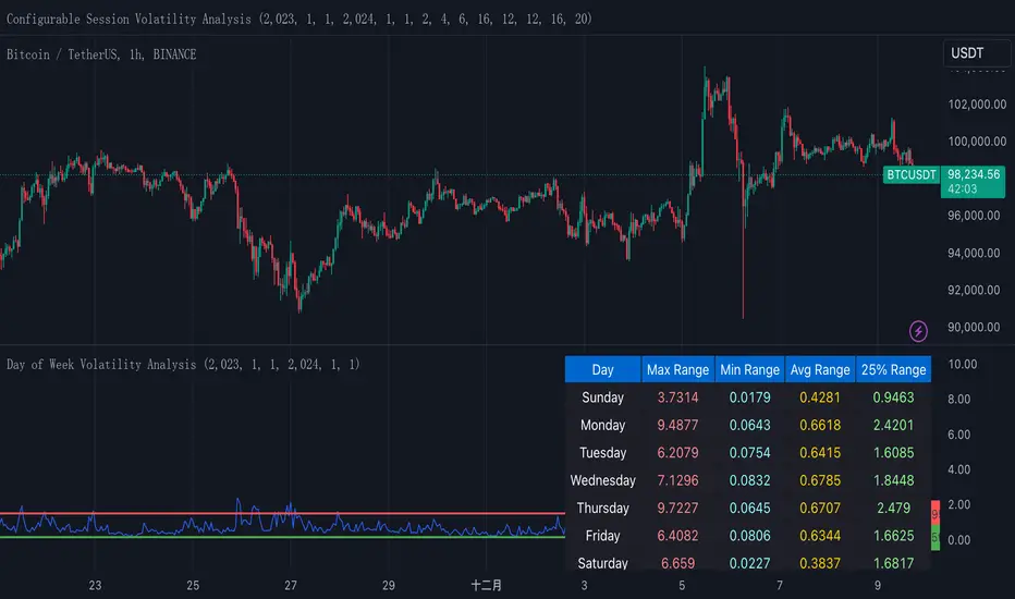 This indicator helps traders analyze daily volatility patterns across different days of the week by calculating normalized price ranges.Unlike traditional volatility measures, it uses a normalized approach by dividing the daily range (high-low) by the midpoint price and multiplying by 100, providing a percentage-based measure that's comparable across different price levels. This normalization makes it particularly useful for comparing volatility patterns across different assets or time periods.