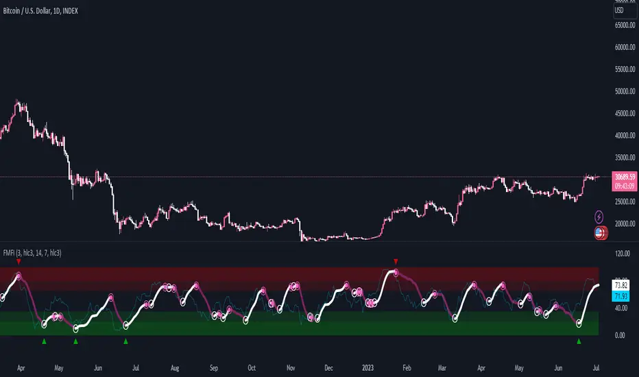 FMFI functions as a trend-following indicator. Bullish trends are denoted by the color white, while bearish trends are represented by the color purple. Circles plotted on the FMFI indicate regular bull and bear signals. Additionally, red arrows indicate a strong negative trend, while green arrows indicate a strong positive trend. These arrows are calculated based on the presence of regular bull and bear signals within overbought and oversold zones. To enhance its effectiveness, it is recommended to combine this indicator with other complementary technical analysis tools and integrate it into a comprehensive trading strategy. Traders are encouraged to explore a wide range of settings and timeframes to align the indicator with their unique trading preferences and adapt it to the current market conditions. By doing so, traders can optimize the indicator's performance and increase their potential for successful trading outcomes.