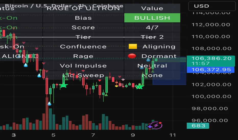 Rage of Ultron is a comprehensive multi-timeframe trading system that combines Smart Money Concepts (SMC) with macro market context, RSI divergences, liquidity sweeps, and volume analysis to identify high-probability setups across all markets.