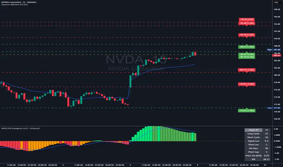 The Dynamic Relevant Support/Resistance (JJC) indicator identifies key support and resistance levels based on recent swing highs and lows and dynamically updates them on the chart. It also provides live % distance labels, VWAP visualization, and breakout/reversal signals, making it a comprehensive tool for intraday and swing traders.