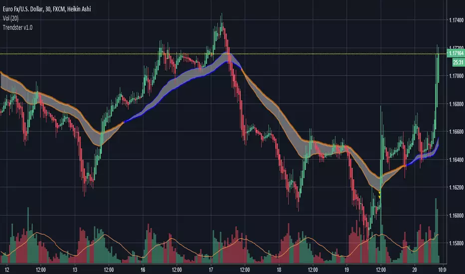Trendster v1.0 will give you simple areas of possible entries (both long and short) in order to jump on board new trends early and stay in the trade for maximum profit. Can be used with most assets including equities, FOREX and cryptocurrencies. Alerts can be created from this indicator allowing for better manual trade timing or autotrading. Happy trading!