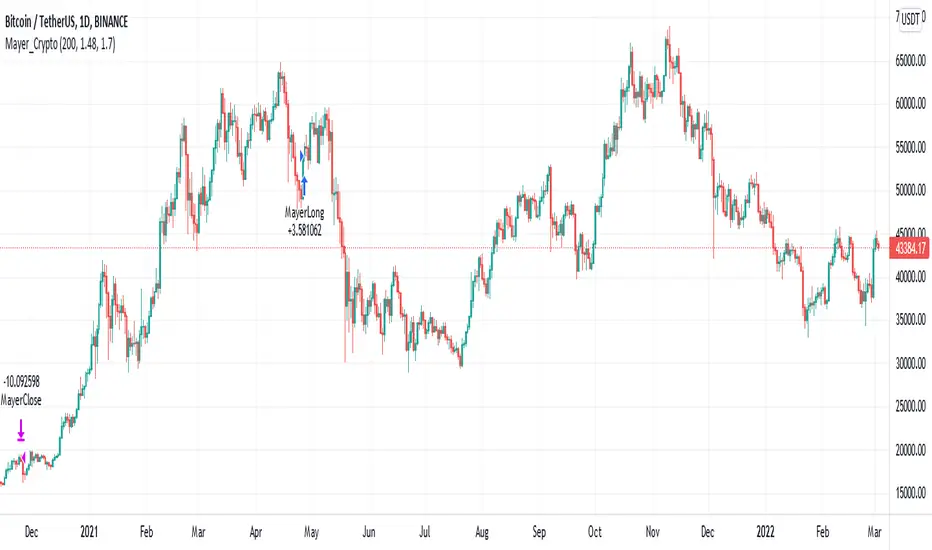 Created by Trace Mayer, the Mayer Multiple is calculated dividing the current price of Bitcoin by its 200-day moving average. This simple script allows to backtest strategies based on Mayer Multiple levels, which can be easily adjusted. It can be tested on any chart and any timeframe.